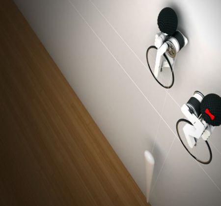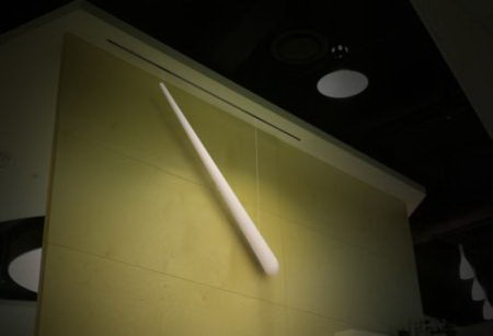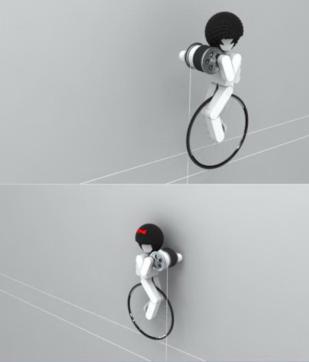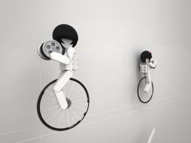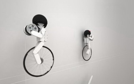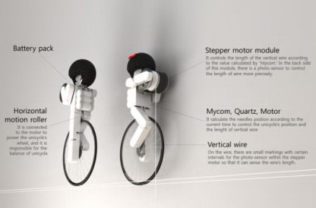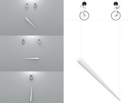 这款挂钟只有一个白色的指针用来指示时间,不过有趣的是,指针是通过细线由上方骑车的小人控制的。一男一女两个可爱的小人,脚下骑着独轮车,手中抱着小滑轮,看起来十分认真地在控制时间呢。把它摆放在家中,肯定可以增添不少乐趣吧。