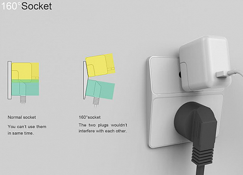 常见的双口与三口一体插座通常只能高效利用其中一个,另一个则因为插座的大小尺寸而被排挤在外。这款一体插座的插孔有一个160°角的斜面,插头可成角度使用,在不增加方形尺寸的基础上提升使用率。