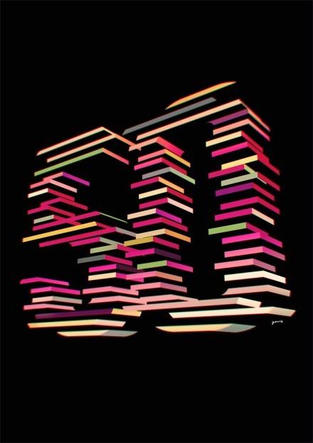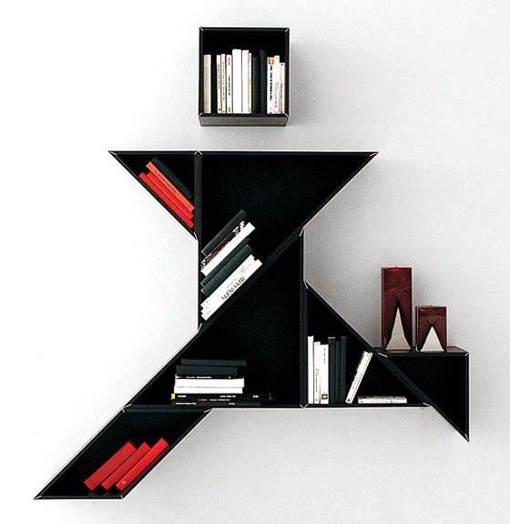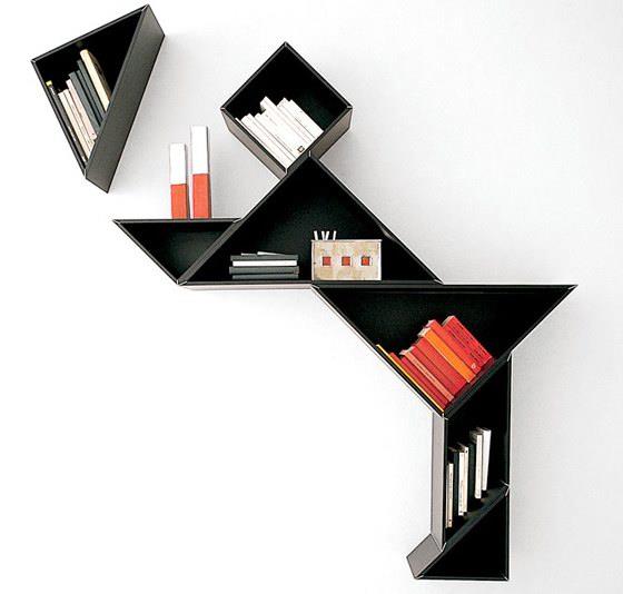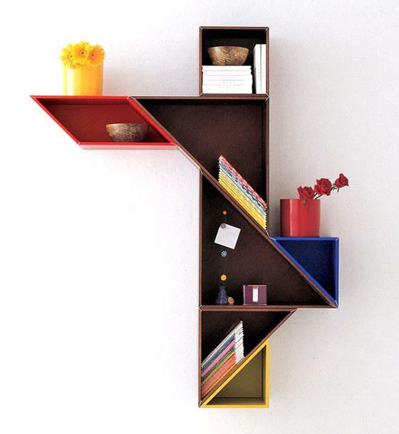 趣味书架。非常类似我们熟悉的七巧板,通过不同的组合,让书架妙趣横生。