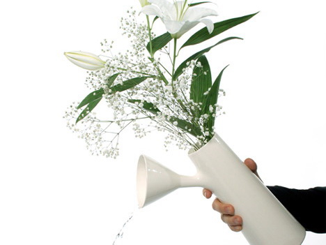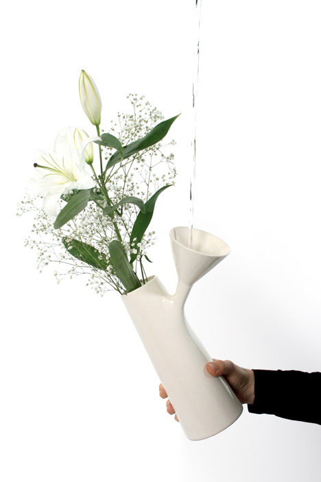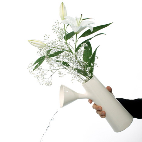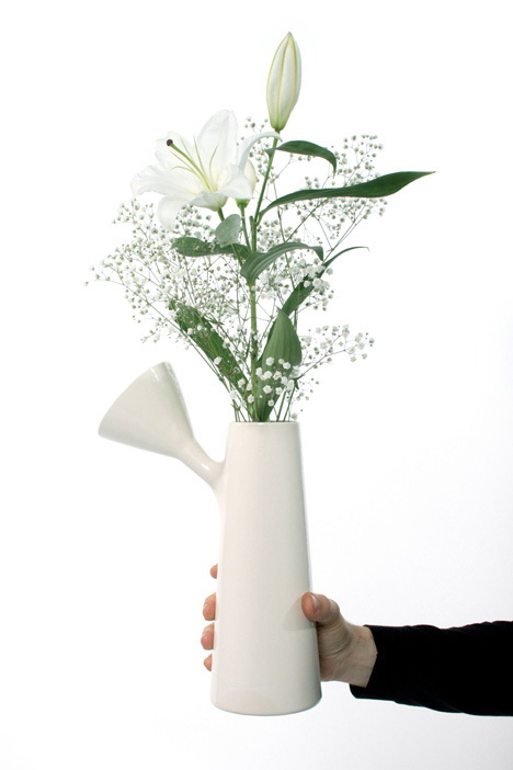 伦敦设计师Roger Arquer设计的这个花瓶方便实用,它的瓶身处探出一个漏斗,水可以从里面倒出,也可以从外面倒入,所以不用挪动花儿也能换水,方便省事。