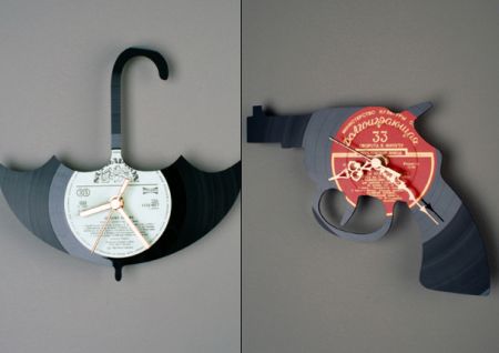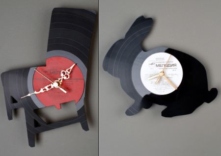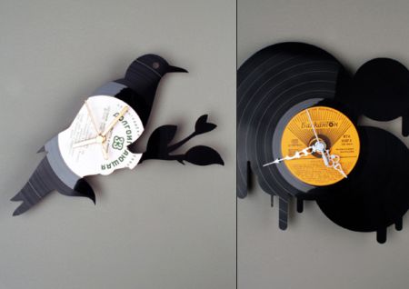 承载了一个时代的黑胶唱片随着科技的发展逐渐淡出了人们的视线,可是人们从来也没有将它们忘记。版本珍贵的黑胶唱片早已千金难求,而那些没什么用处的也在设计师灵巧的手中变成了精致的装饰品。这一套钟表都是由旧唱片改造的,各式各样的造型搭配唱片本身的颜色,形成了十分独特的风格,非常适合装饰家居。