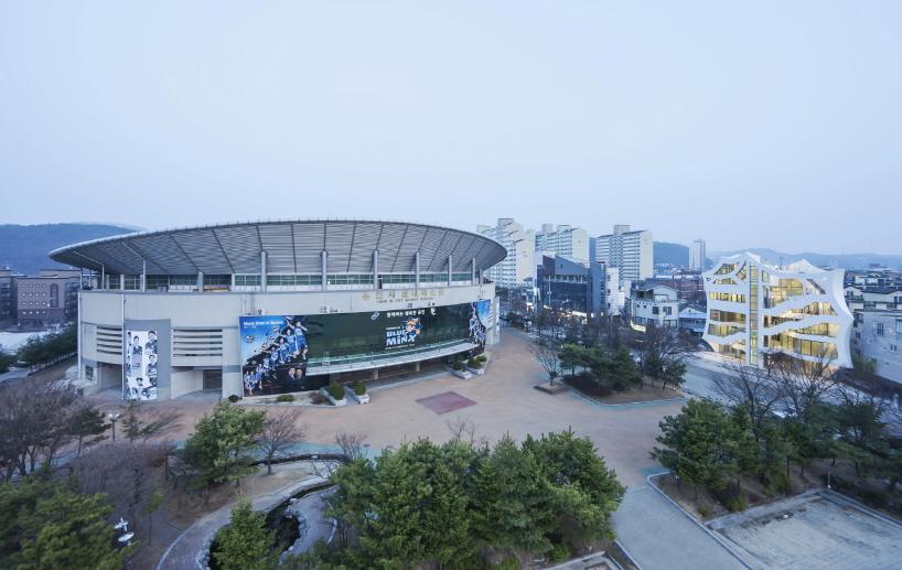 建筑近旁是一个巨大的,类似运动场的体育馆。因此,IROJE KHM赋予了“archi-fiore”独特的“消极”外观,与其环形结构直接相反。建筑师想要在韩国首尔的京畿道龙仁市下属的cheoin-gu创建一个辨识度高的地标。