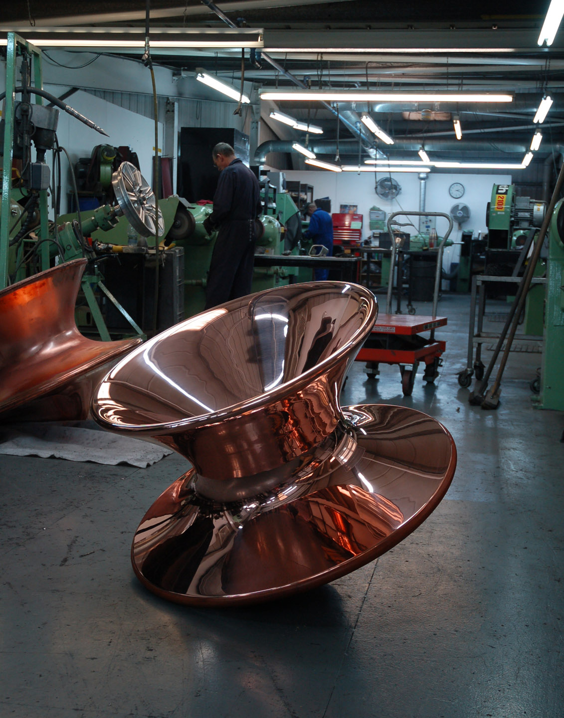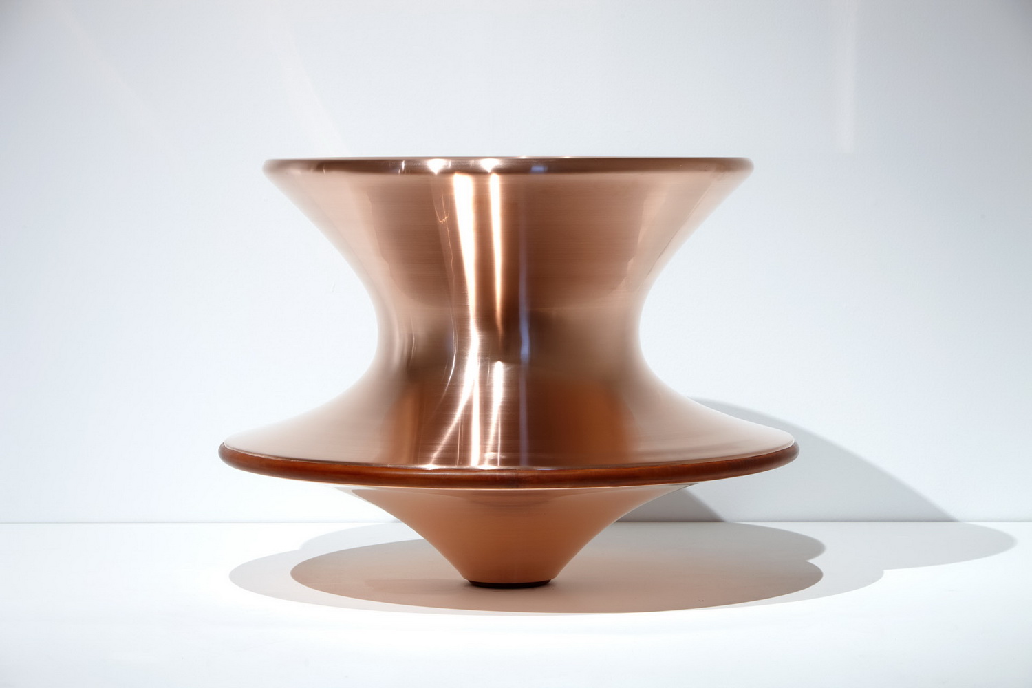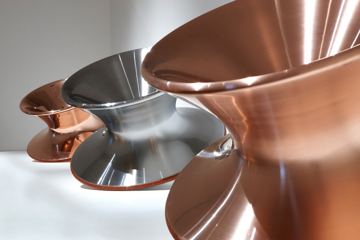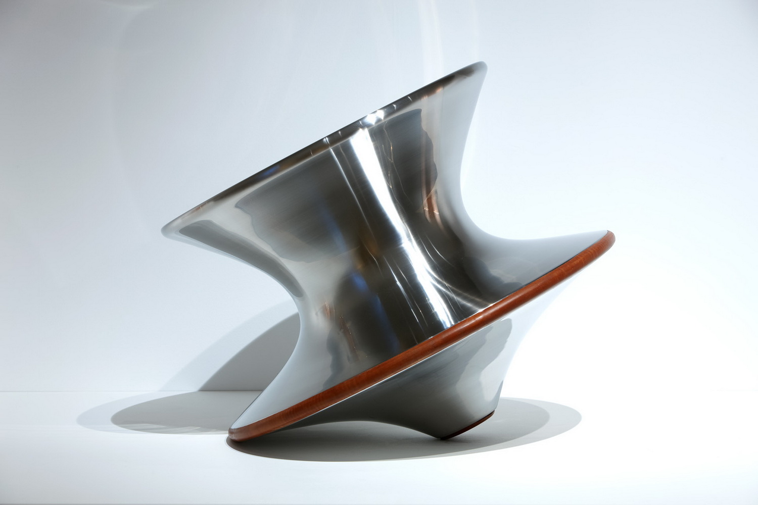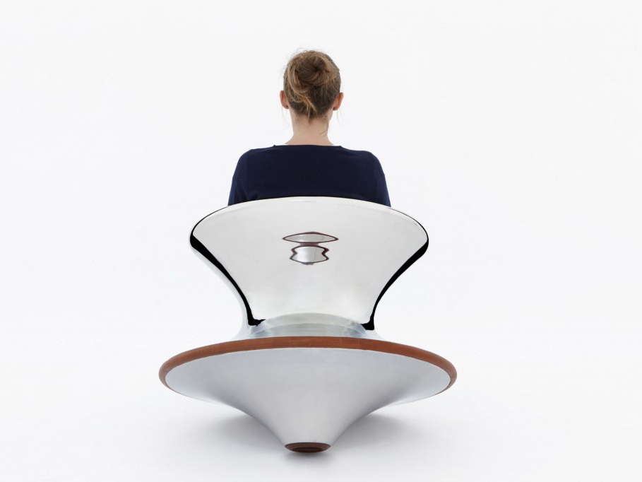 这个设计来自对于几何学的思考,一个完全旋转的几何形状可以形成一个舒适的座椅吗?它看似一个非常具有雕塑感的花瓶,但是侧过来却是一个非常舒服且很有功能性的椅子,人们可以左右摇晃,还可以360度旋转。