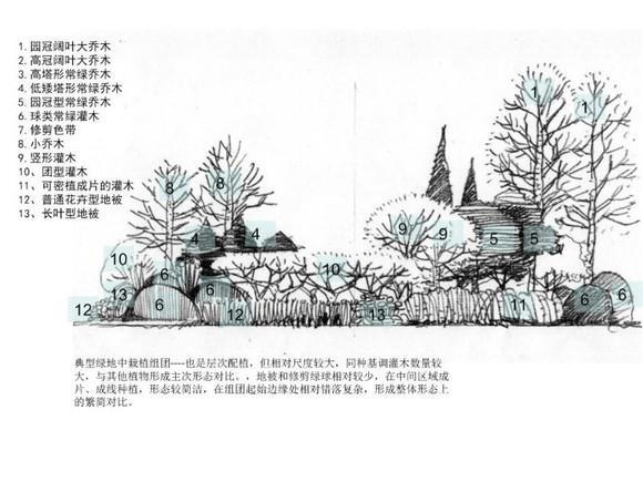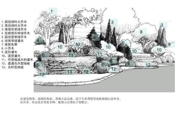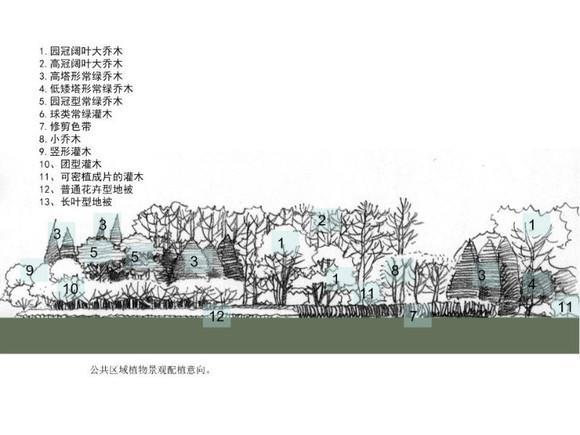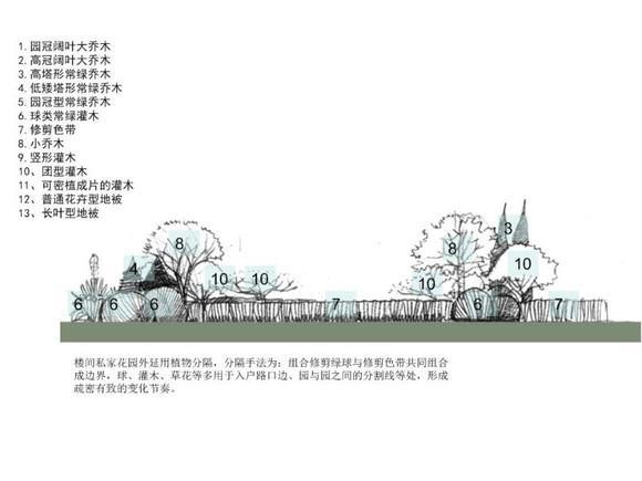 二、花园洋房区建筑间绿地区域。此区域绿地面积较大,在组团种植时应当注意组团之间的开阖变化,在密植组团之间留出相对较大的草坪面积。植物组团在不同位置植株错落程度和组合方式不尽相同,大致可分为绿地中普遍栽植、在构筑物、出入户、建筑物周围等处的栽植和宅前花园分界栽植等3类。以下是几种配植类型图示,图中数码对...