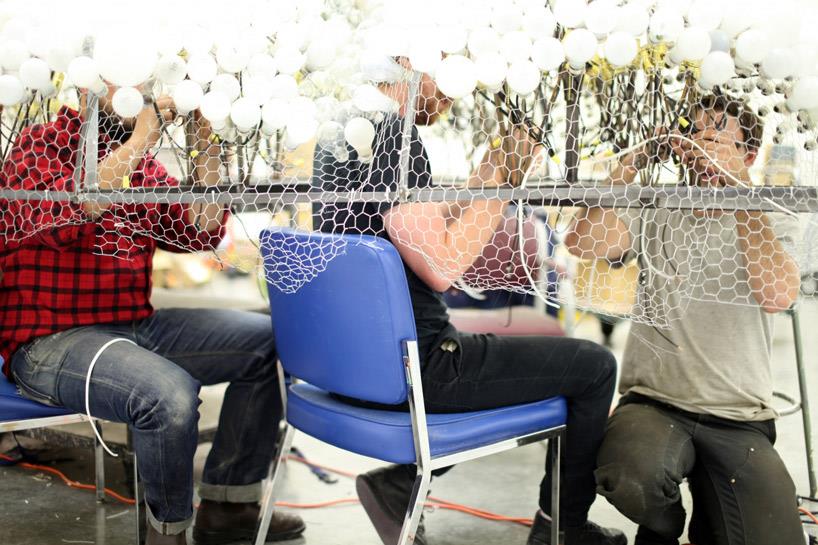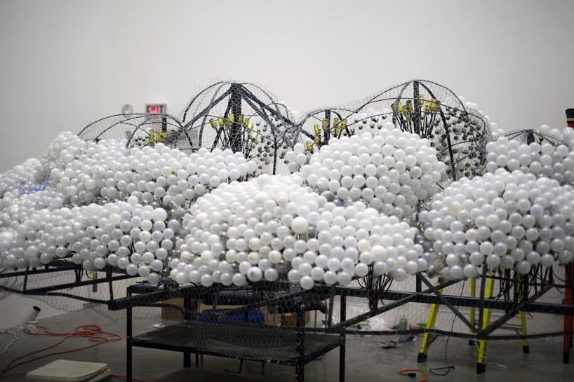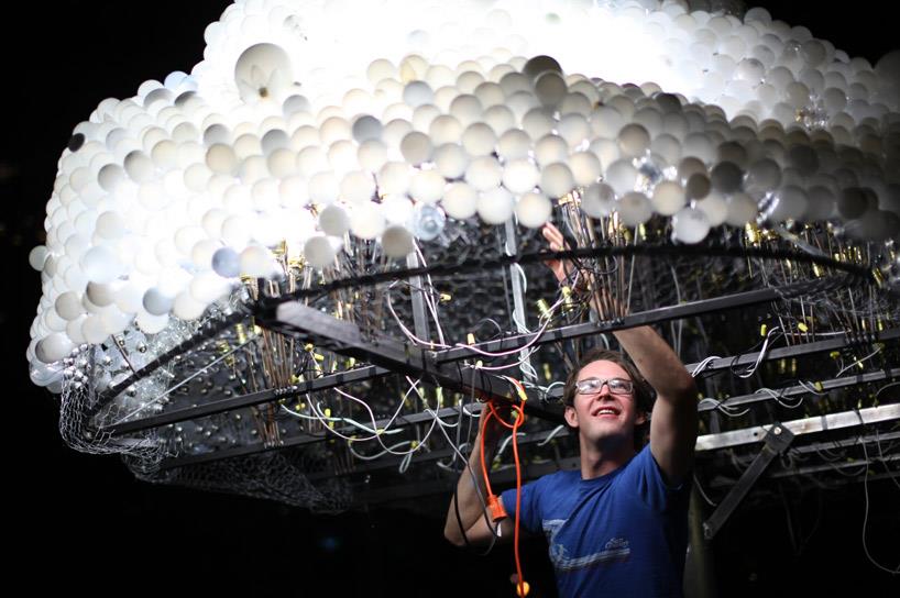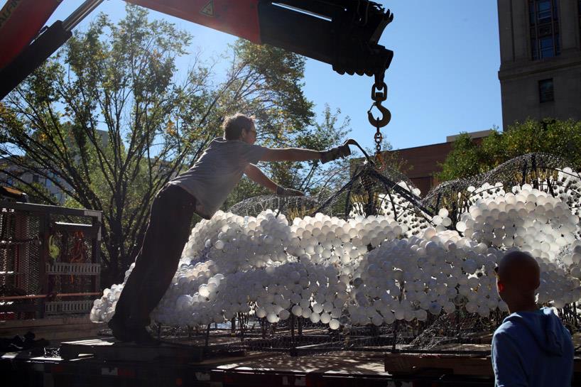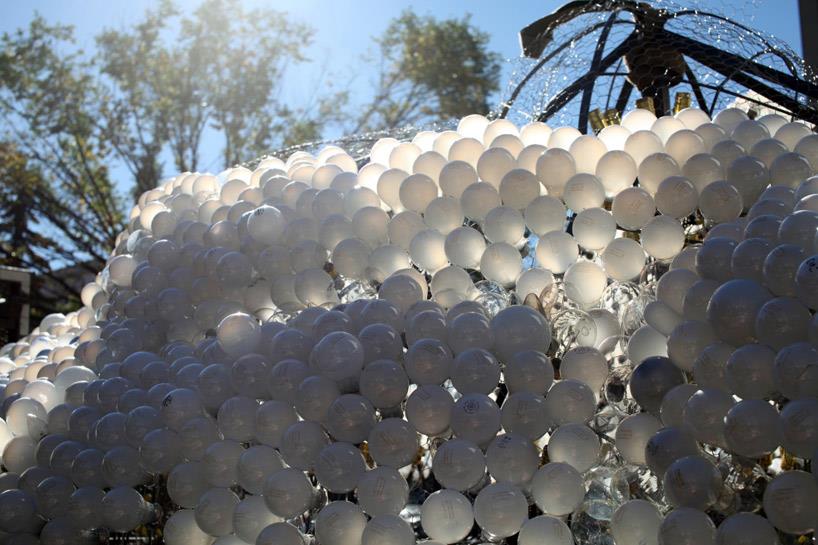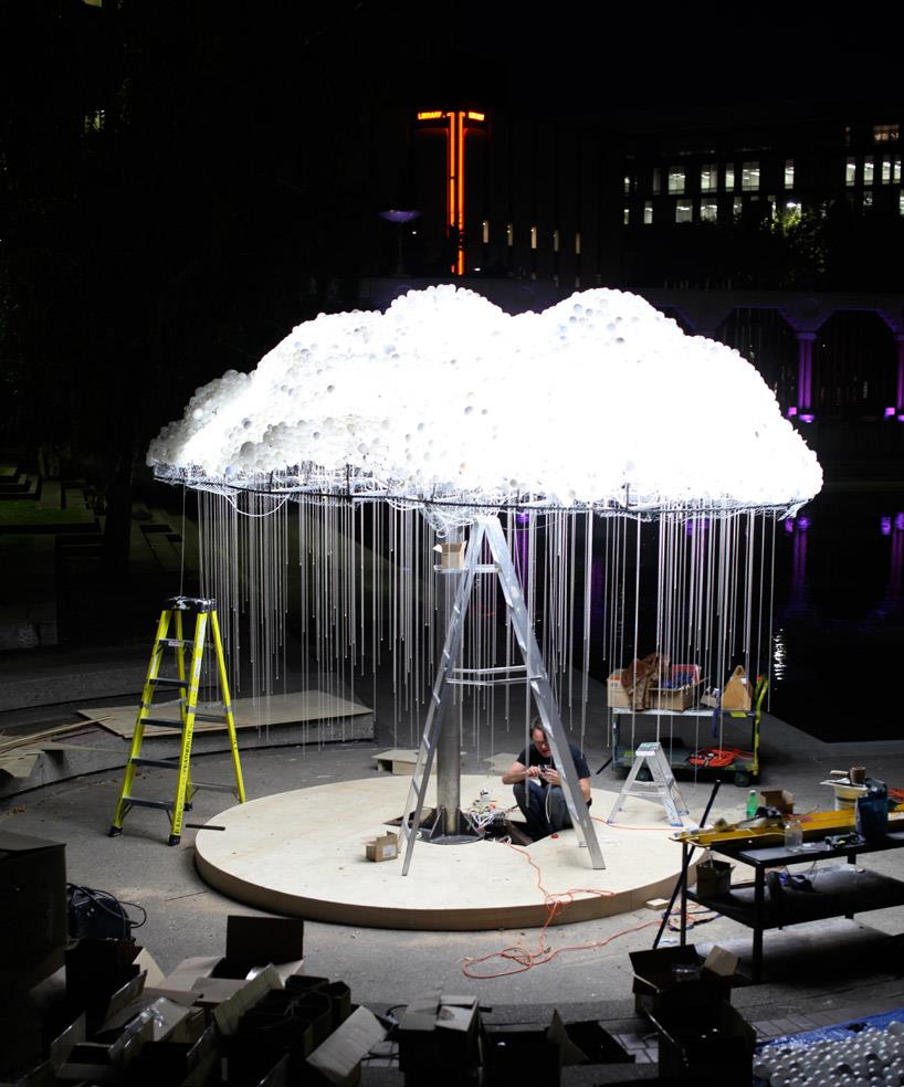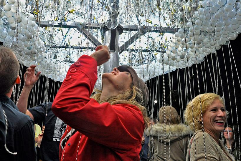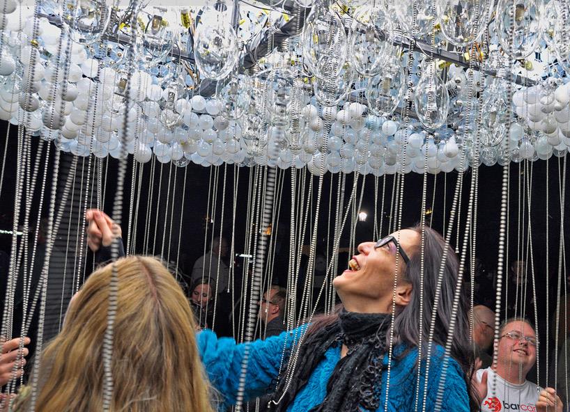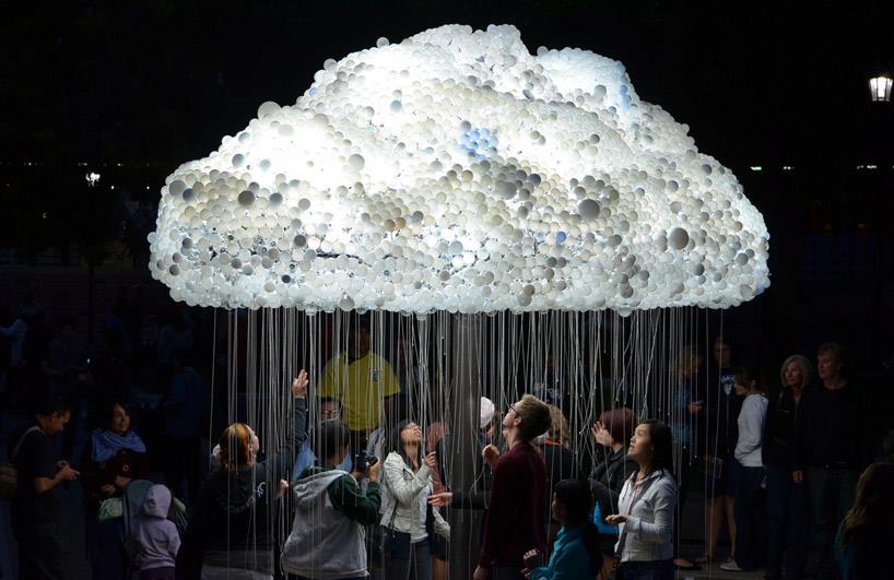 由加拿大卡尔加里艺术家caitlind brown设计的“cloud”,是一个原比例的互动灯光装置,公众可以站在装置旁将上面的灯泡拿下来或安装上去,这种互动行为创造了一个灯光闪烁的巨大云朵。艺术家使用钢铁,金属拉绳,和六千多个亮灯泡和烧坏的灯泡来制作。这个设计对废物进行重新构想,用一种不同的艺术视角来处理过剩的材料。“...