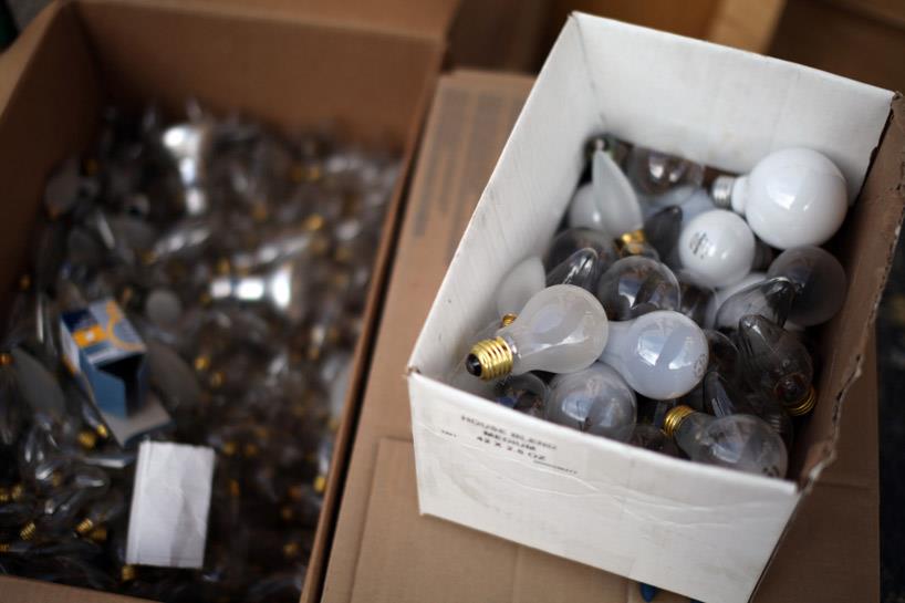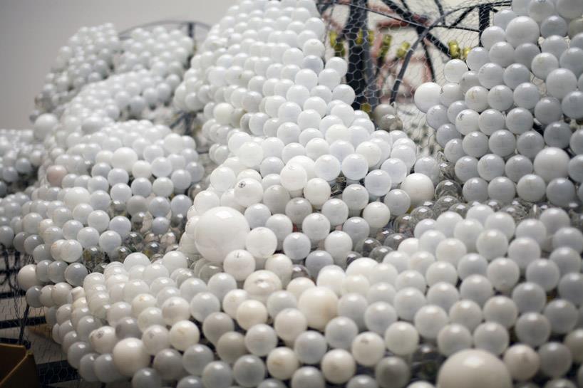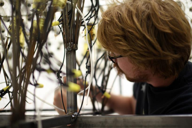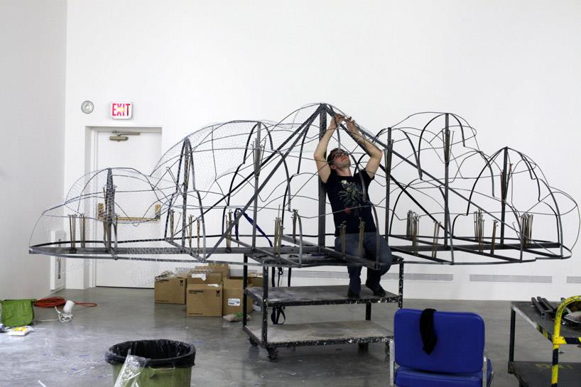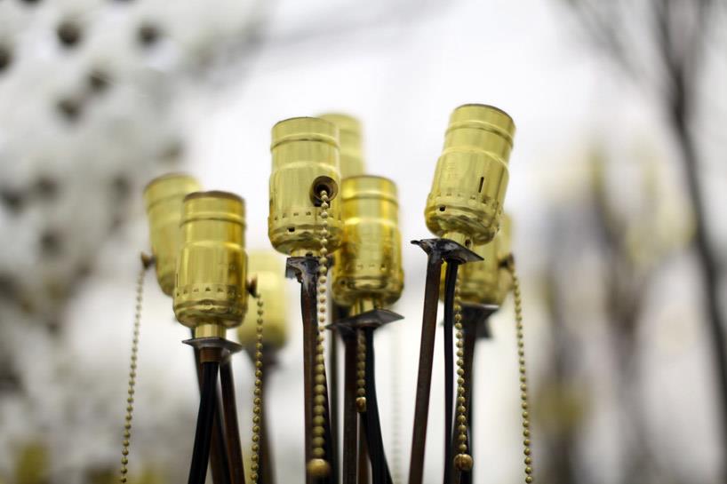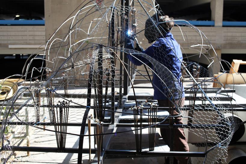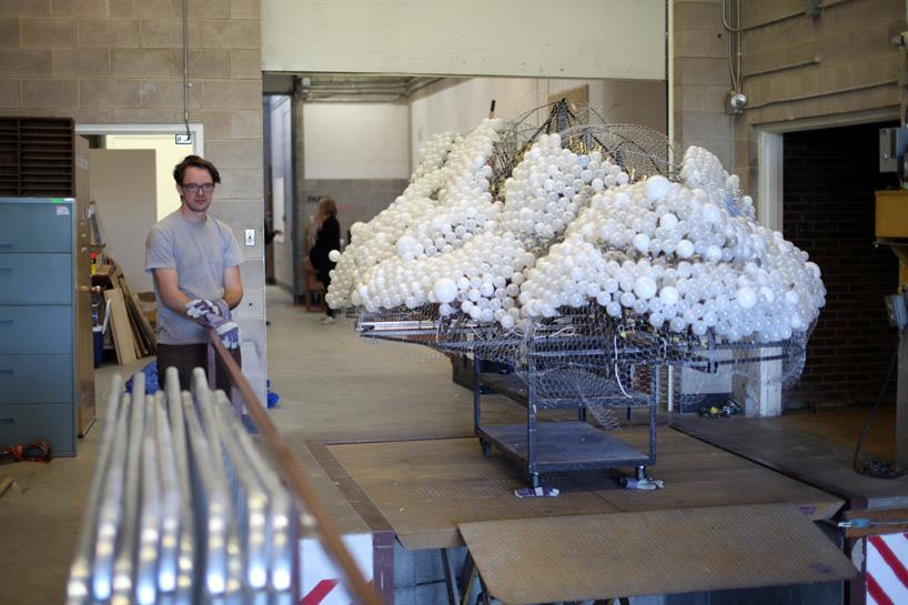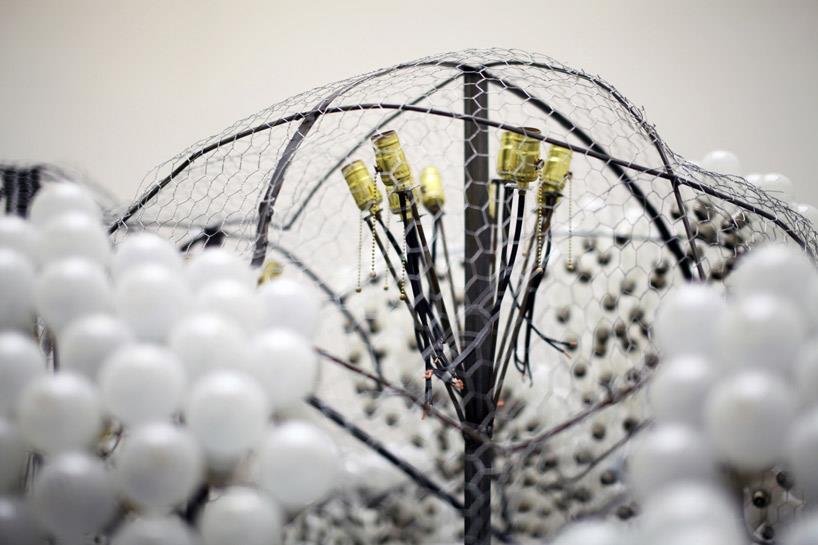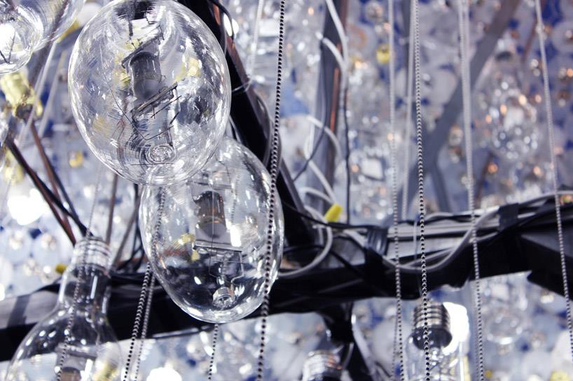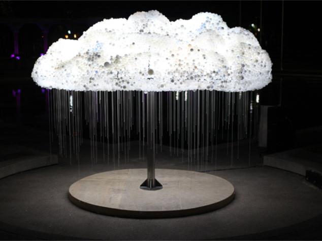 由加拿大卡尔加里艺术家caitlind brown设计的“cloud”,是一个原比例的互动灯光装置,公众可以站在装置旁将上面的灯泡拿下来或安装上去,这种互动行为创造了一个灯光闪烁的巨大云朵。艺术家使用钢铁,金属拉绳,和六千多个亮灯泡和烧坏的灯泡来制作。这个设计对废物进行重新构想,用一种不同的艺术视角来处理过剩的材料。“...