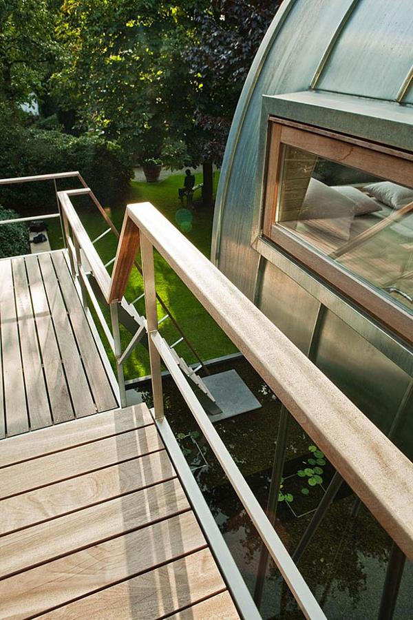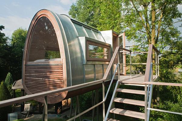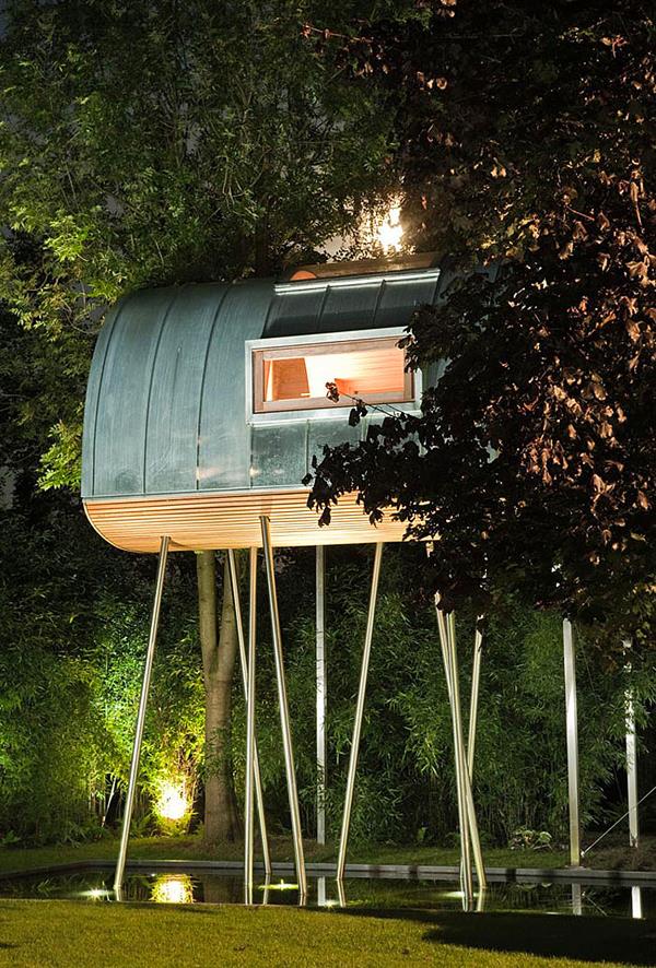 Tree House “King of Frogs”设计方:Baumraum位置:德国 明斯特面积:8.5平米这个装置富有创意,其实并不算传统意义的树屋,没有以活体树木做支撑,而是建在长长的杆上,在屋里能远眺倒影池。树屋面积虽然不大,还带有9平米的露台。这个装置位于当地一户私人住宅的后院里。