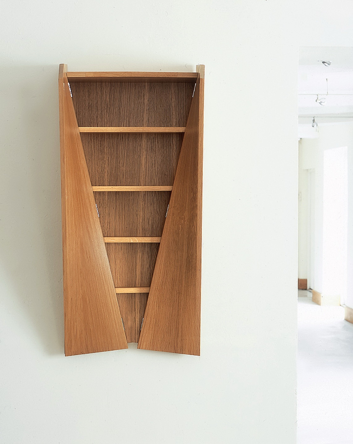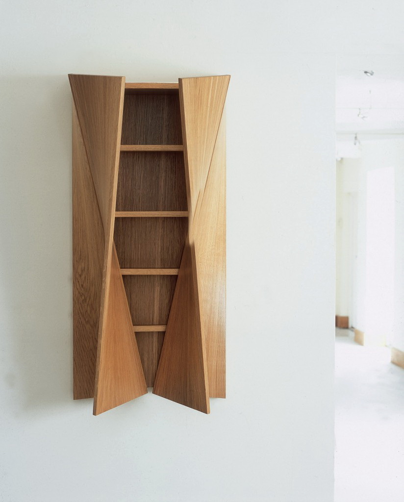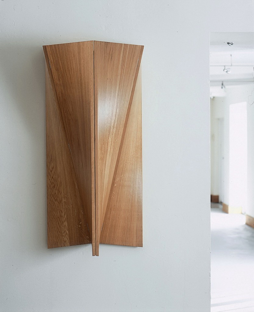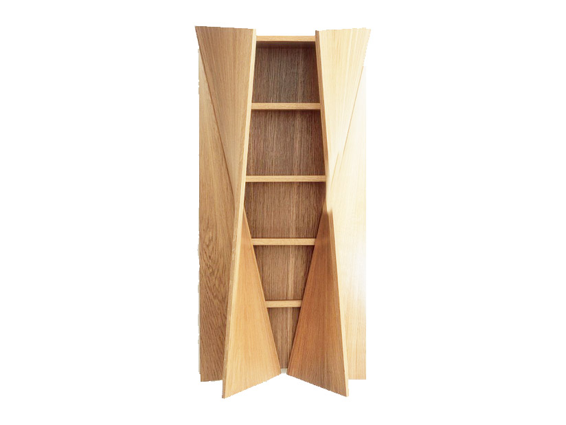 扭曲柜的设计是对几何结构的大胆探索,通过简单工具的应用,设计师试图打造一个带90度角的柜子门,这个门其实是由两组相同形状的木板组成的,两组木板互相拼接形成门和柜