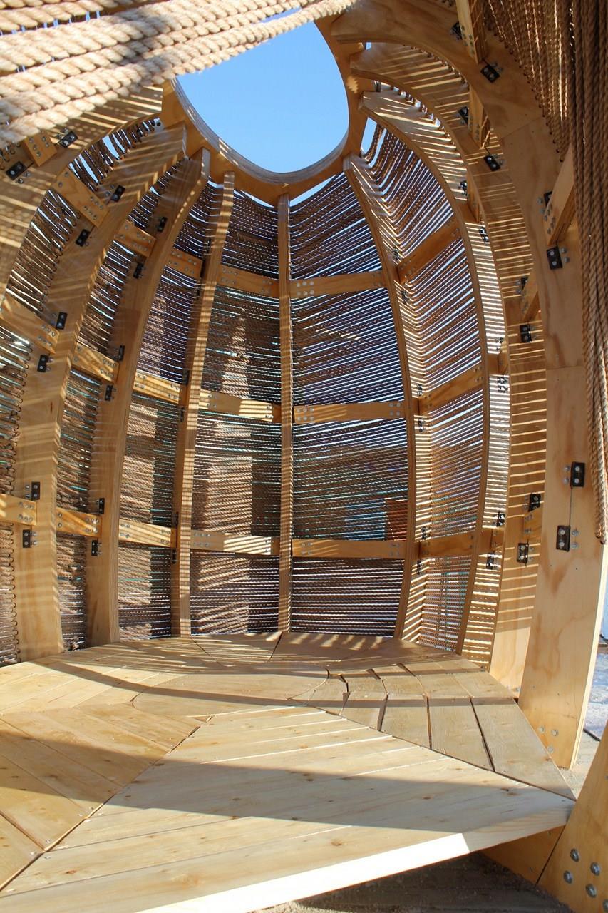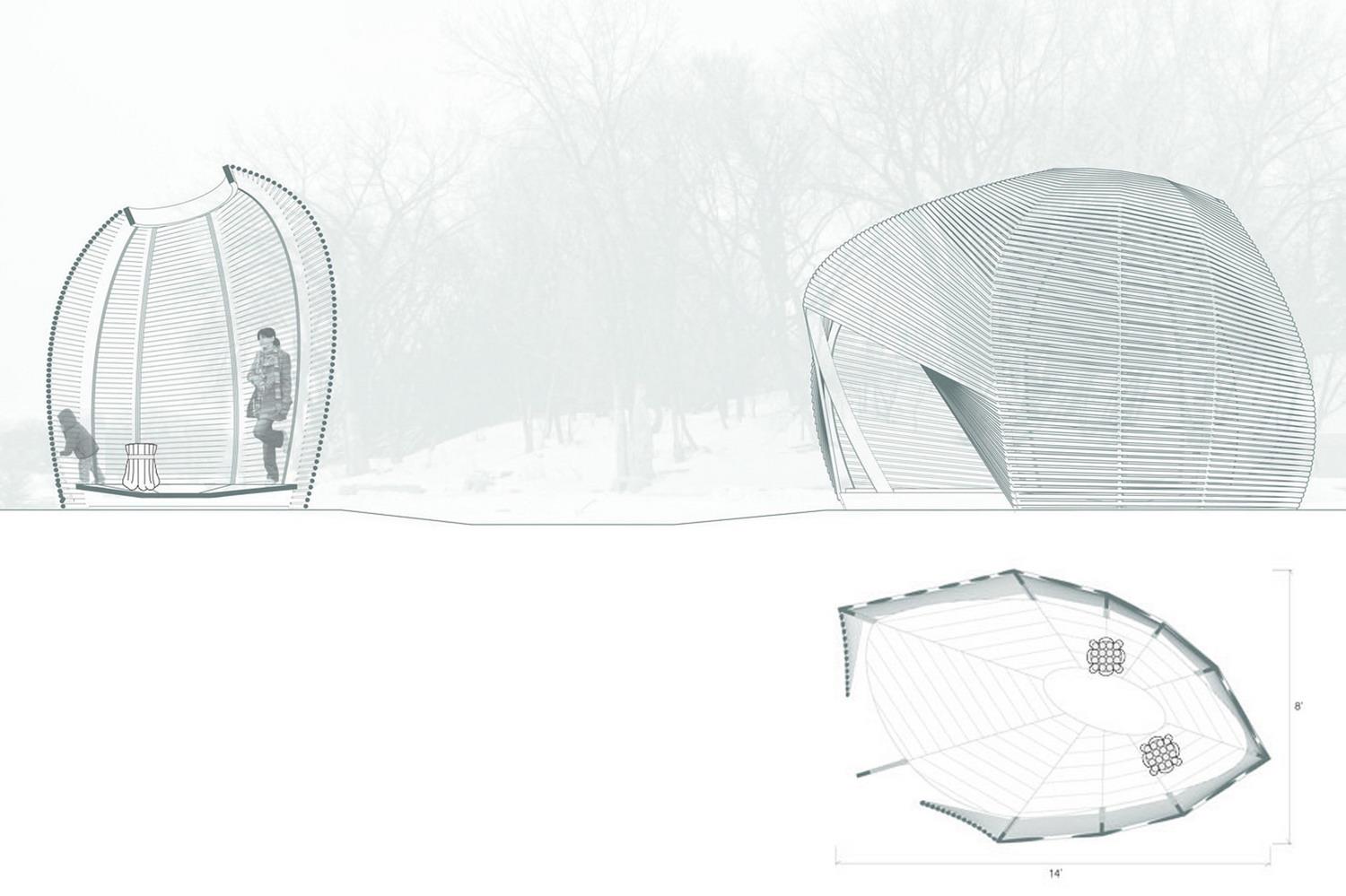 设计师:Frank Gehry, Patricia Patkau和Antoine Predock图片提供:Kevin Erickson温尼伯市的阿西尼玻河是世界上最长的自然封冻滑冰道,每年有超过400万的游客前来游玩。沿着滑冰道每一千米就有一个暖房供游人取暖。这个绳索编织形成的结构是2012年暖房设计竞赛的获奖者,是一个融合了艺术和建筑元素的亭子。这个暖房用材简...