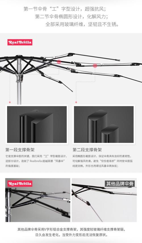 RealBrella不会淋湿肩膀的雨伞,来自新锐设计师的全新作品。不规则的伞面,可以解决传统圆形雨伞的造型造成人们肩膀和后背被雨淋湿的痛点;更高的伞骨强度,更好防晒功能;专利手柄设计,增加了LED照明功能。这个雨季,让你与众不同。折叠后只有30cm长,便携再也不是问题;多彩可选;伞内三层黑胶涂层,防晒系数50+;伞面纳米...